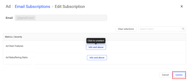 Ads AI Alert Email Subscriptions allow Admins to subscribe and unsubscribe user email addresses to Ads AI alert notifications, as well as set specific AI alert metric severity and notification level for each user.