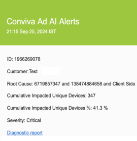 Ads AI alert notifications enable proactive performance troubleshooting and corrective actions for performance anomalies, providing diagnostics for the sessions attributed to the dimensions associated with the root cause of the alert along with the impacted viewers. For more details, see AI Alert Diagnostics.