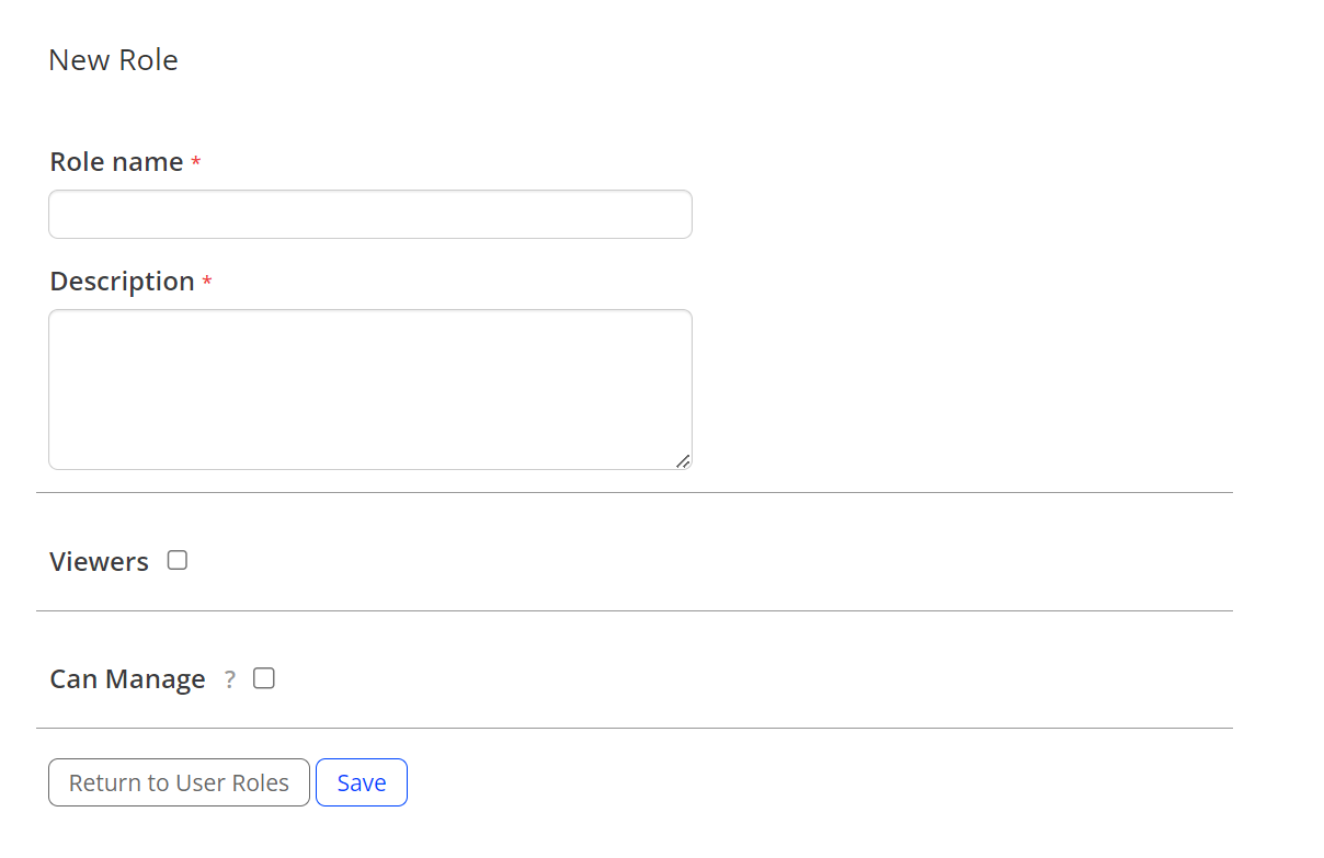 To create a new user role, click New User Role. The User Role page appears with the options for the role name and settings.