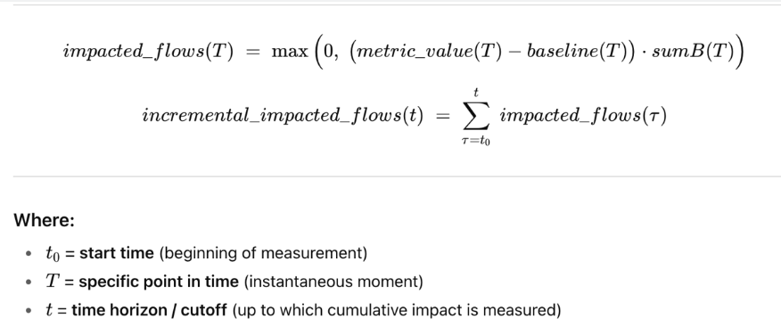 Incremental Impacted Count = (Expected Successes − Observed Successes) over the evaluation window, or the equivalent delta for the monitored rate.