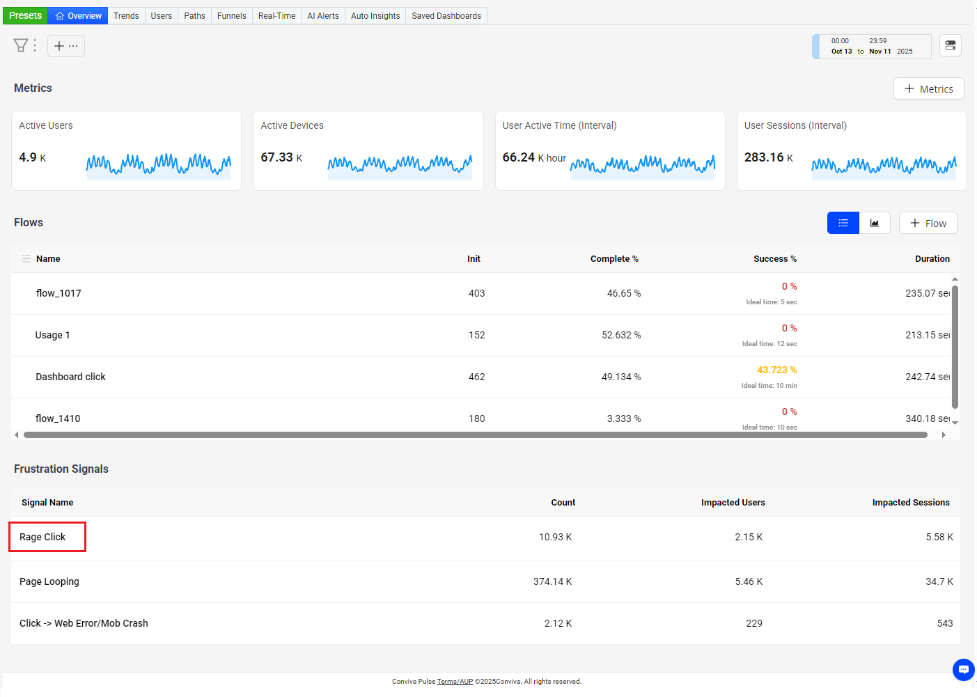 Use the Overview dashboard to display Frustration Signals related to the current Flows. Clicking a signal name opens the diagnostic page for detailed analysis of the user impact and signal behavior.
