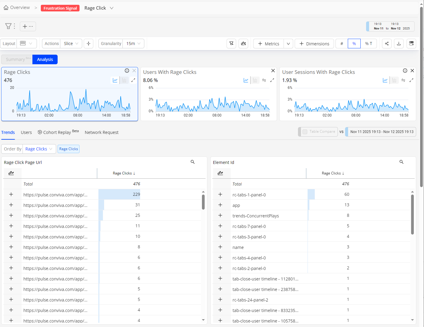 In this example, the Frustration Signal page displays user time series for data slicing and the dimension tables for pages and UI elements originating rage clicks, enabling advanced drill-down snalysis across imapcted user, pages, and UI elements.