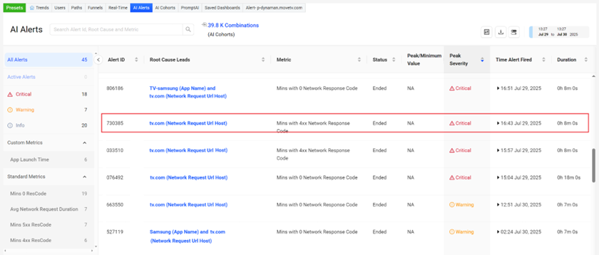 For each generated Mins with x Network Response Code alert, DPI lists the alerts in the AI Alerts page and inserts the timeline markers in the related metric time series with links to a AI alert diagnostics page for detailed alert analysis with focused dimension drill-downs along with analysis of impacted users and network requests.