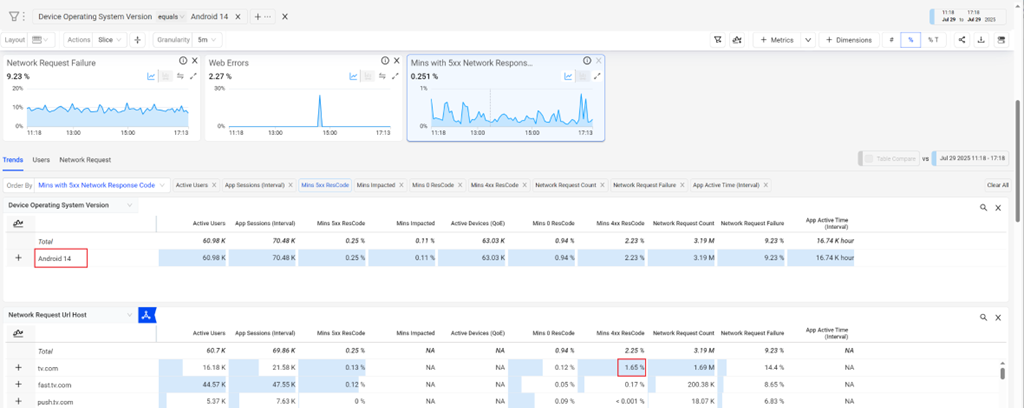 These metrics apply ‘Minutes of Active Time’ as the secondary metric to frame the scope of the impacts with the amount of active user time. The Minutes of Active Time secondary metric also functions as the denominator in the percentage metrics, calculated by dividing the minutes with x response code by the minutes of active time during the selected time period. The percentages help isolate how prevalent the network request performance issues were across different dimensions.