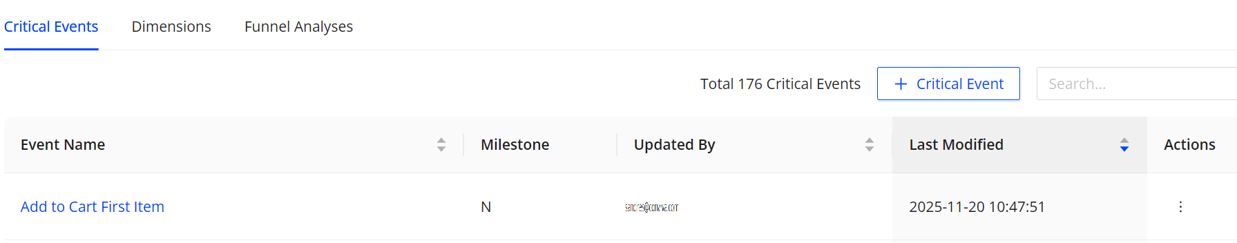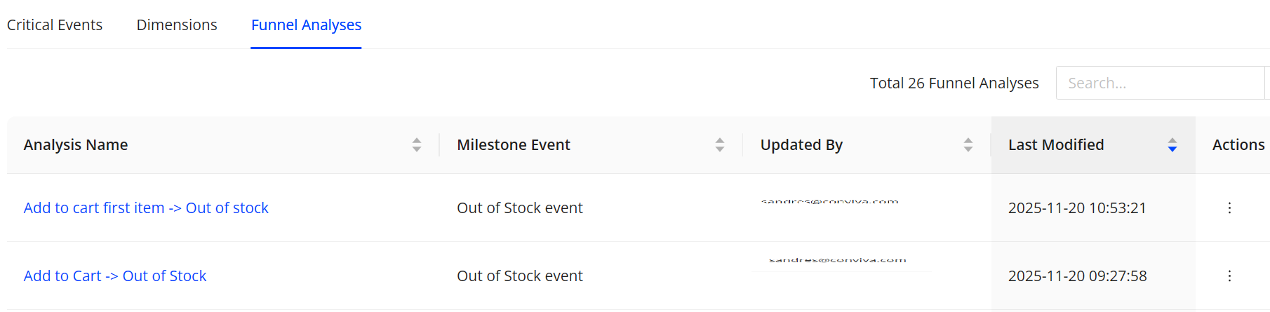 A Funnel represents a defined sequence of steps leading toward a configured ending event. The Funnel Analyses tab displays the full list of created Funnels, including each Funnel’s configured ending event (milestone) and its update information.