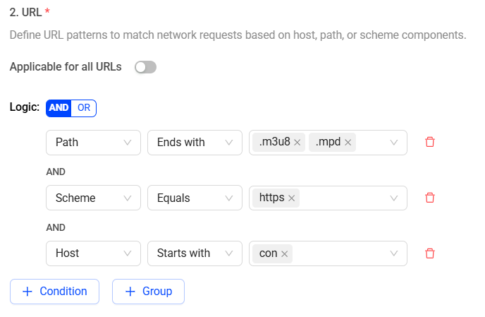 Click the + Condition button to add more conditions. This creates another row to select to add mode and + Group buttons to add more conditions and group multiple conditions together. This creates a new row to select host, path, or scheme with a matching criteria.