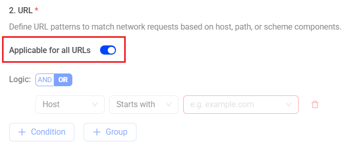 Select the Applicable for all URLs option. Accordingly, the URL section becomes disabled.