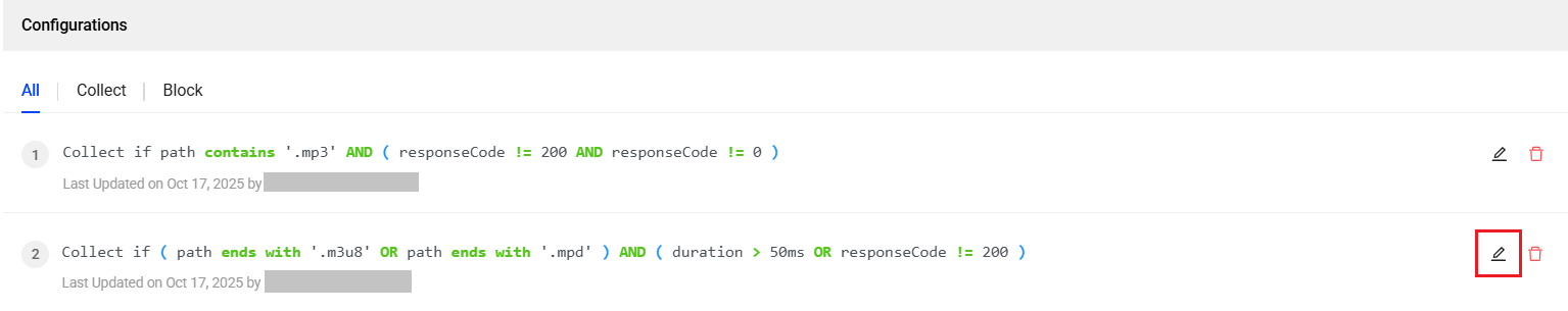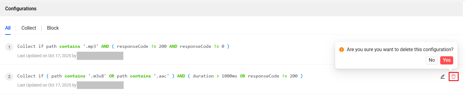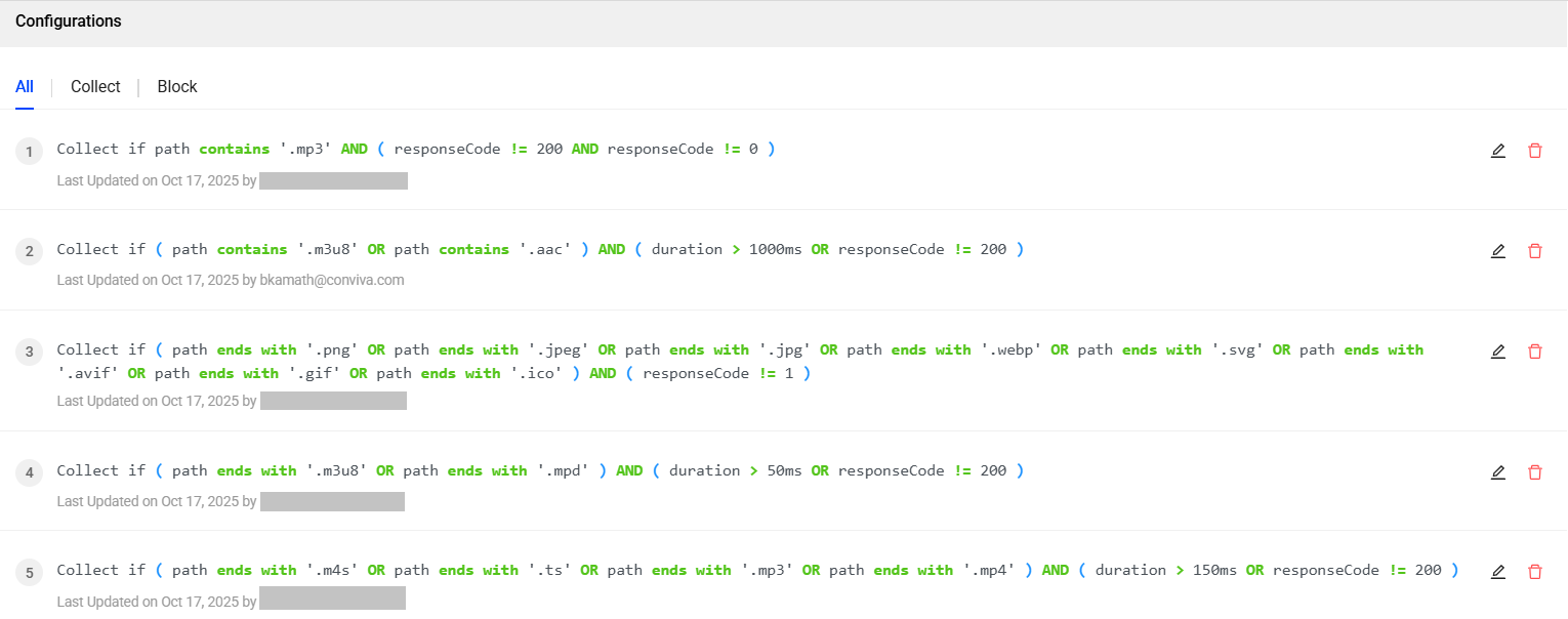 Intelligent Collection optimizes the volume of network request collection by overriding the default URL blocklist with the Collect/Block rules. Configure the rule using hostname, path, or scheme-based filters for collecting a specific set of network requests. If needed, use the response codes and duration-based filters for more granular-level collection.