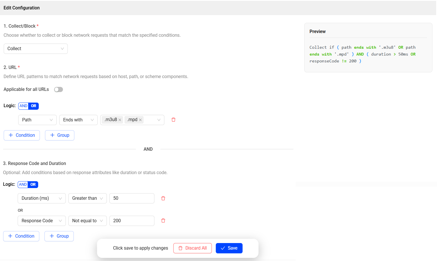 (Optional) Specify additional criteria based on the response duration and status code to collect/block network requests more precisely.
