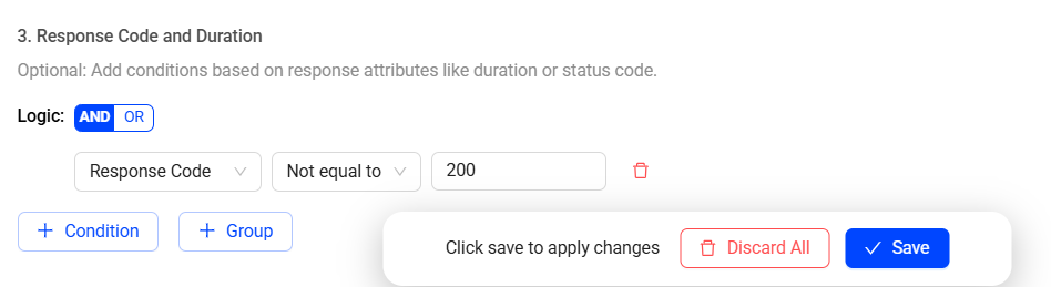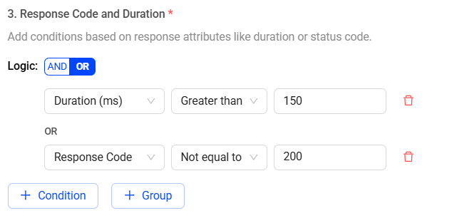 Click the + Condition button to add more conditions. This creates another row to select response code or duration with a matching criteria.