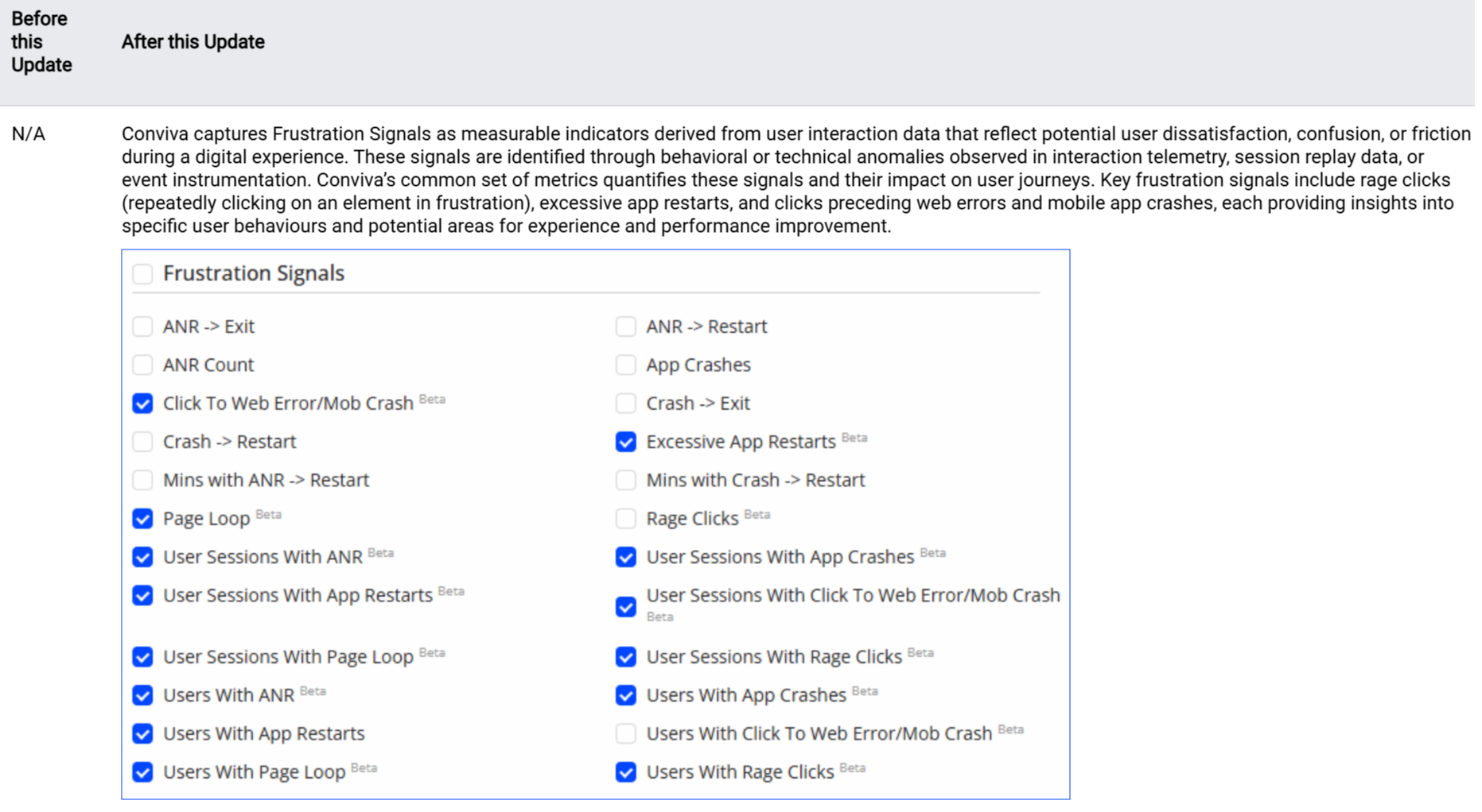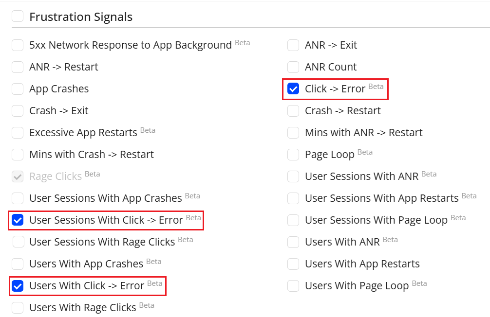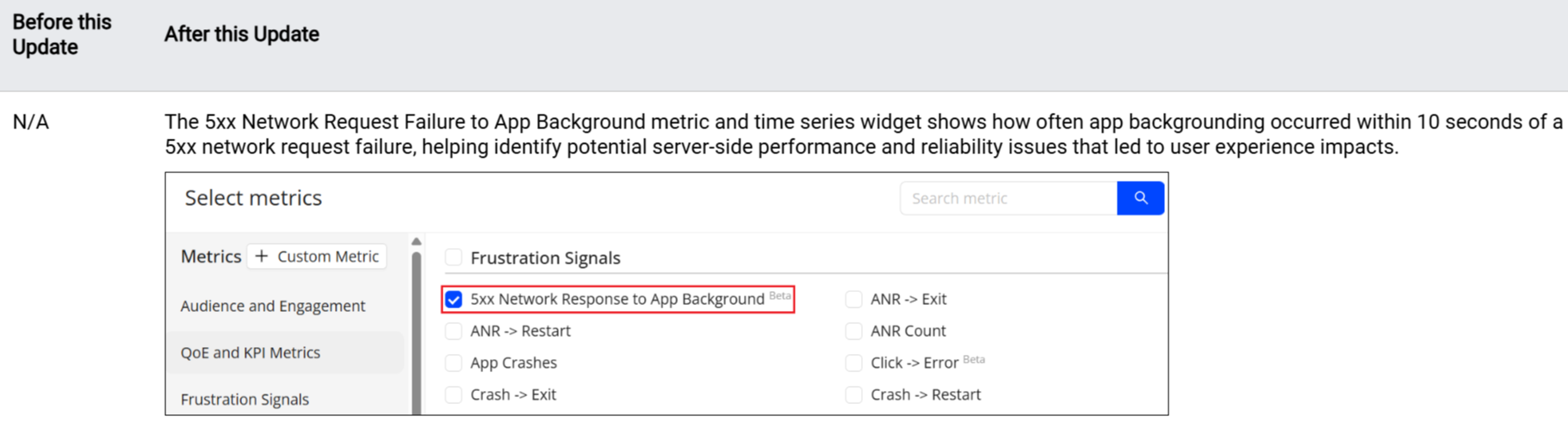 Metrics: Adds Metrics (Beta) for Excessive App Restart, Page Loop, Click → Web Error / Mobile Crash. Also, adds User Session and User Metrics for ANR, App Restart, Page Loop, Click To Web Error/Mob Crash, and Rage Clicks