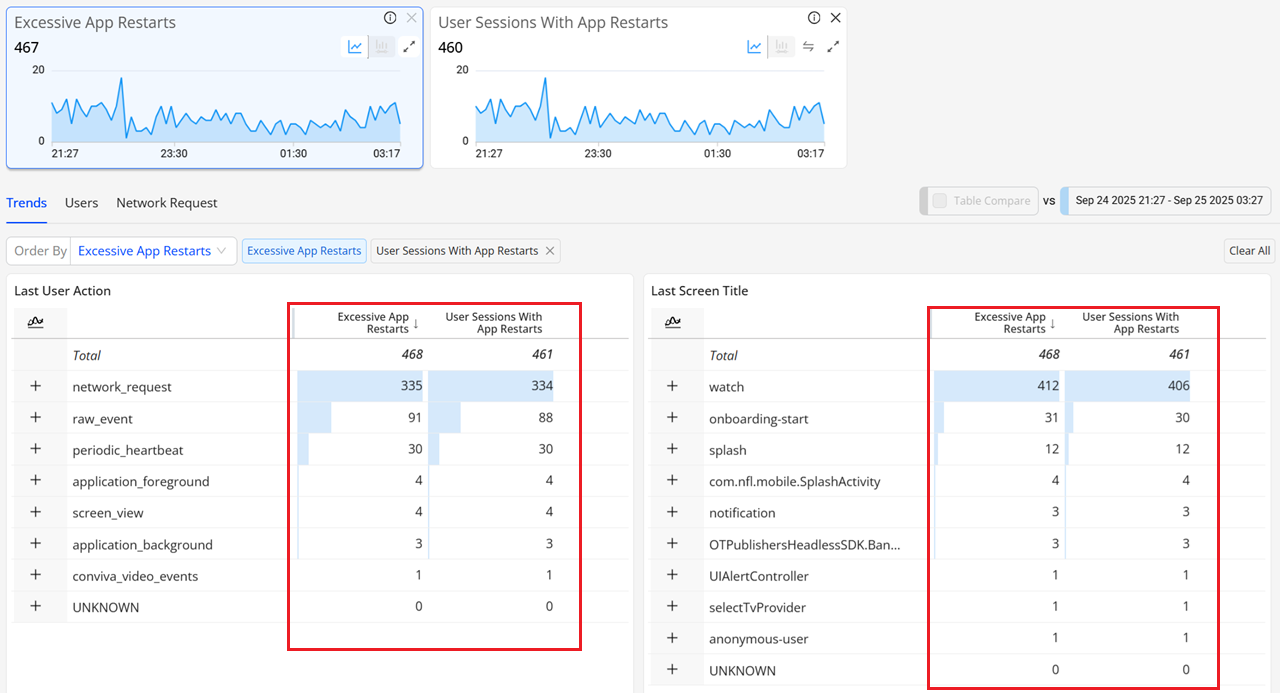 Comparing Excessive App Restarts and User Sessions with App Restarts can help quickly identify the abnormal app restarts impacting large number of users that may signal potential app crashes or a restart loop. For example, repeated spikes in Excessive App Restarts that impact large number of user sessions across a daily time series can indicate regular surges in high usage that strain system resources, such as memory, CPU, and storage, caused by memory leaks or misconfigured resource limits.Operations teams can monitor and correlate repeated-restart patterns to address stability issues before they significantly impact user experiences.