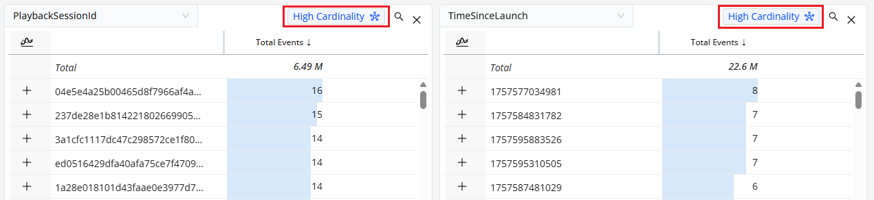 Introduces a High Cardinality button that categorizes High Cardinality dimensions in Trends. A dimension is considered as high cardinality if more than 80% of the total dimension values are unique. Typically, High Cardinality dimensions contain millions of values where most entries are unique. Examples include Order ID, Error Code, or Search Query, with high levels of unique entries. Clicking the High Cardinality button displays the lists of up to 200 sample events from the last 24 hours. Use the Client ID or User ID links for further analysis.