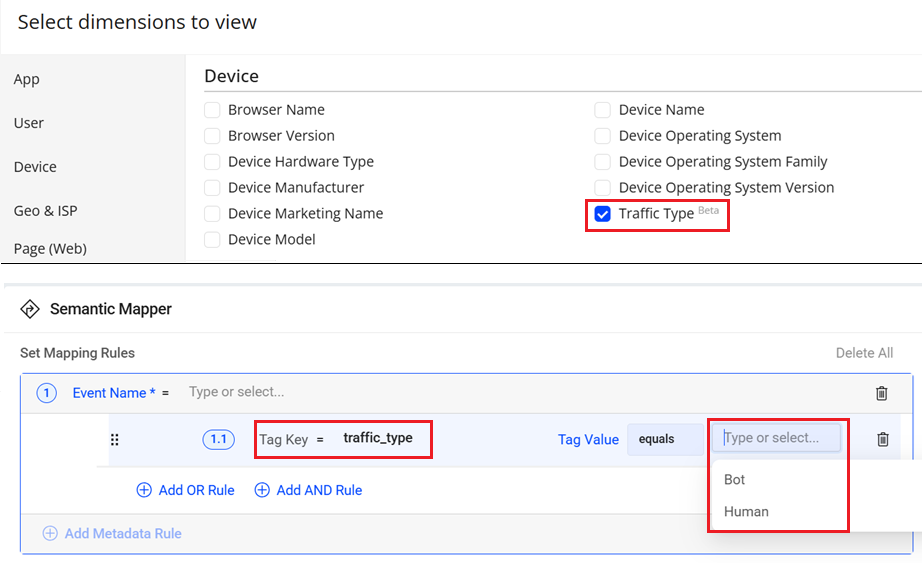 Introduces the Traffic Type dimension in the Trends Dashboard to filter metric distortions caused by automated (bot) traffic, enabling more accurate and actionable analysis across Trend metrics, Flows, and network performance. This enhancement consistently identifies human versus non-human traffic, improves semantic data alignment across systems, and supports advanced traffic filtering and control capabilities. Traffic Type is also exposed as a metadata field under Activation for semantic mapping, allowing definition of Human or Bot traffic in event mapping rules to ensure accurate metrics by excluding automated traffic from metrics and Flows.