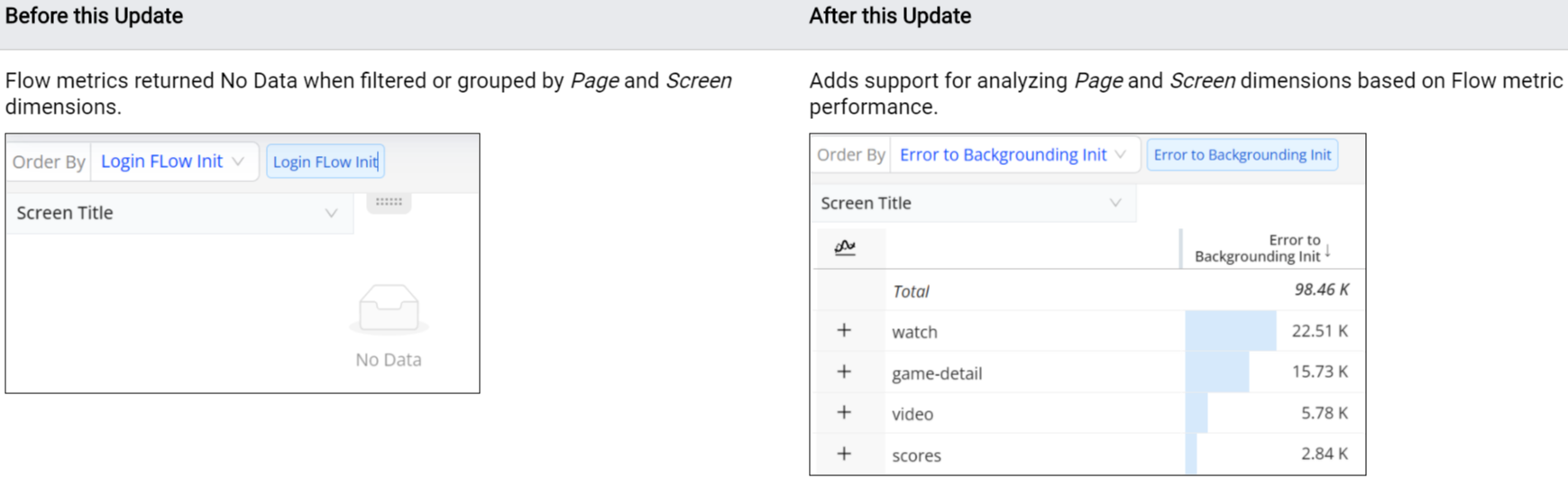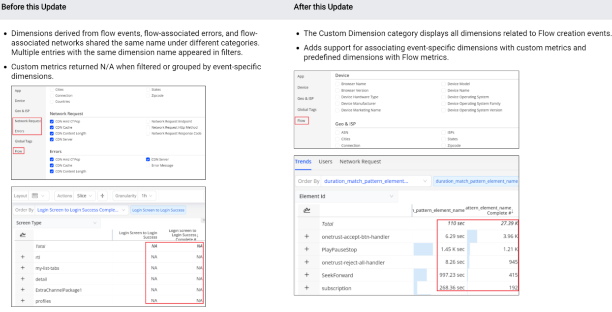 Combines together event-specific dimensions from the Network & Request and Errors categories into the Custom Dimension category in the Preset dashboard. This change makes it easier to select flow-related dimensions from a single category and prevents duplicate dimensions from appearing across other categories when they are tied to flow creation events.