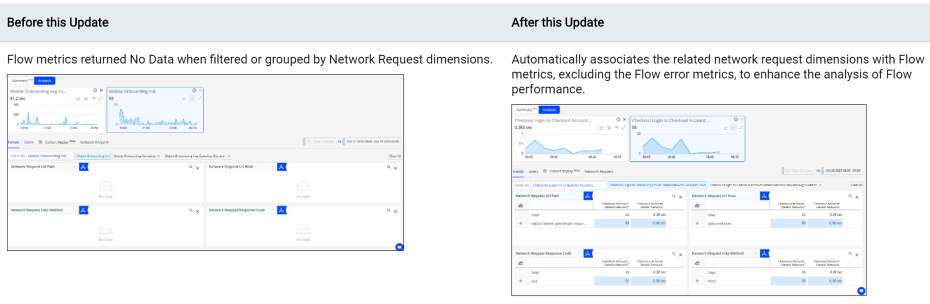 Automatically associates the related network request dimensions (Network Request Url Host, Network Request Http Method, Network Request Url Path, Network Request Response Code) with Flow metrics, excluding the Flow error metrics, to enhance the analysis of Flow performance.