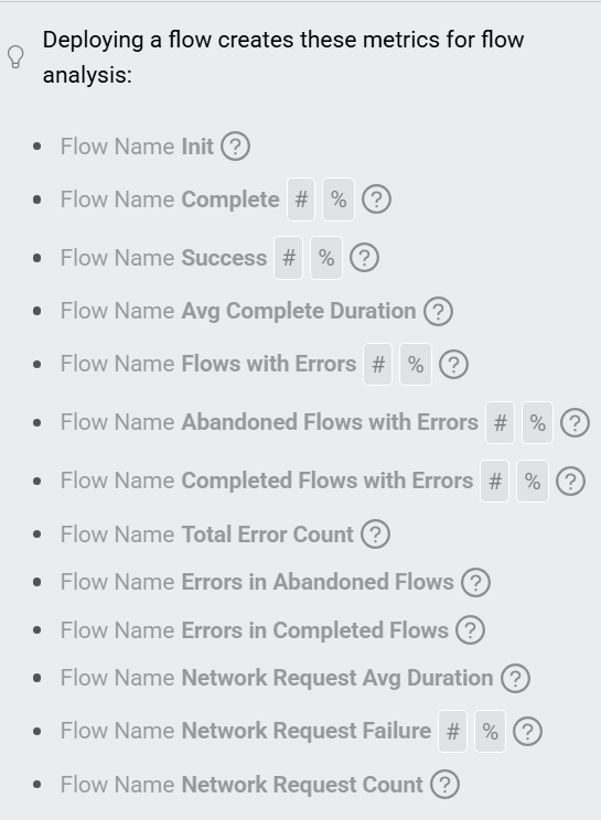 Flows with Errors An error occurred within the flow. Critical Error Abandoned Flows with Errors The flow failed to complete with an error. Non-Critical Error Completed Flows with Errors The flow completed with error. Avg Duration Avg Complete Duration The average duration applies to complete flows. Active Devices Unique Devices To specify the count is for unique devices. Active Users Unique Users To specify the count id for unique users. -