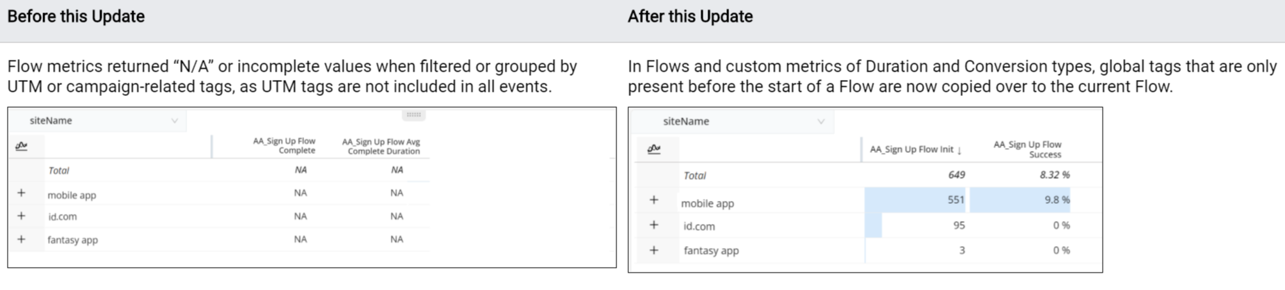 For a Flow with UTM tags, improve UTM analysis with UTM values displayed throughout the Flow, even when the tags are present only before the start of the Flow.