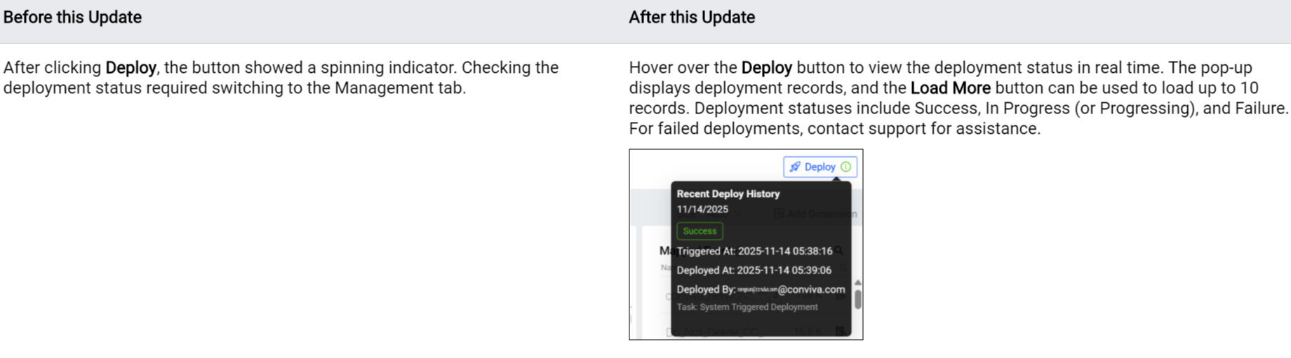 Adds support for displaying detailed deployment status messages when hovering over the Deploy button in Activation. This improvement enables quick verification of the latest deployment status without navigating to other tabs, enhancing deployment visibility.