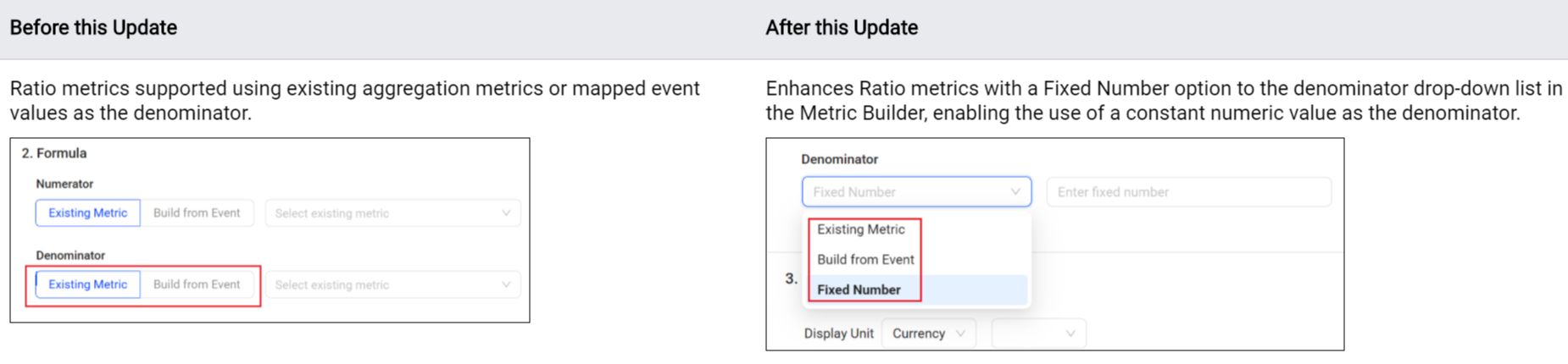 Enhances Ratio metrics to support using a fixed number as the denominator, expanding the flexibility and applicability of Ratio metrics.