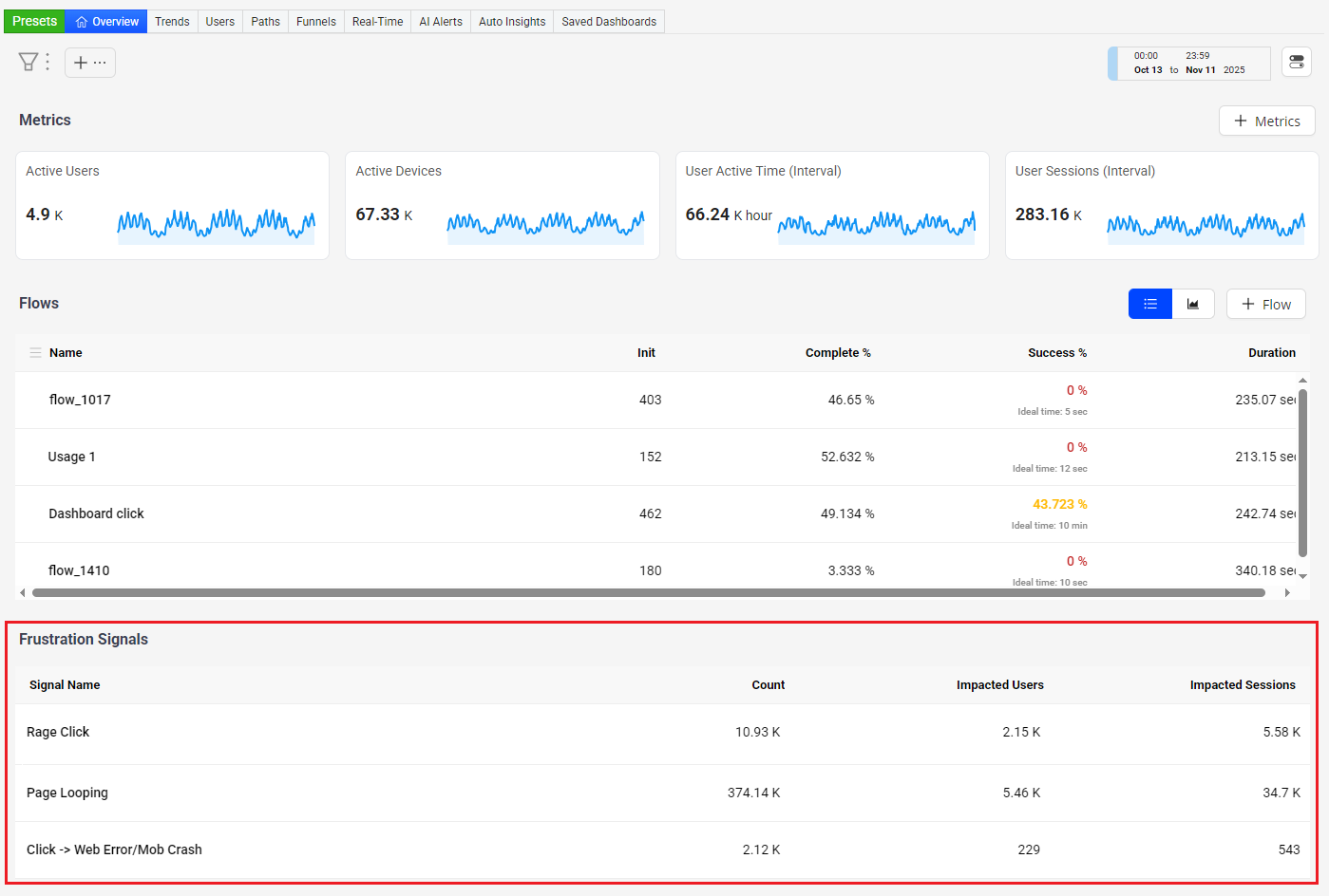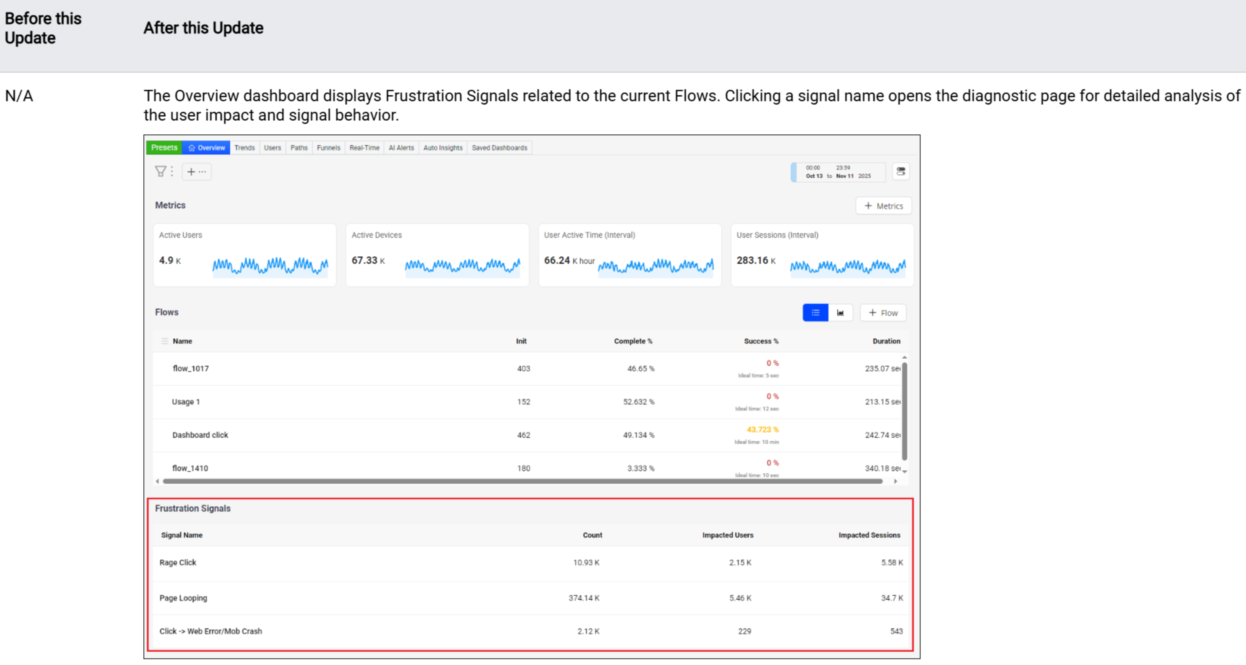 Adds Frustration Signals related to the current Flows to the Overview dashboard. Clicking a signal name opens the diagnostic page for detailed analysis of the user impact and signal behavior.