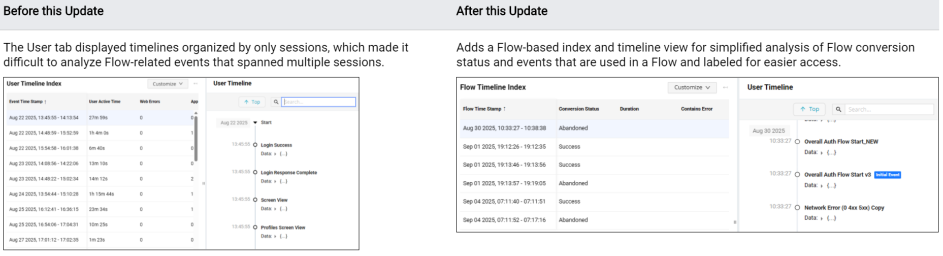Adds support for Flow Timeline Index and User Timeline under the Users tab, completing the workflow of Flow analysis and enabling drill-down to sampled flow sessions where critical events are labeled in the timeline view.