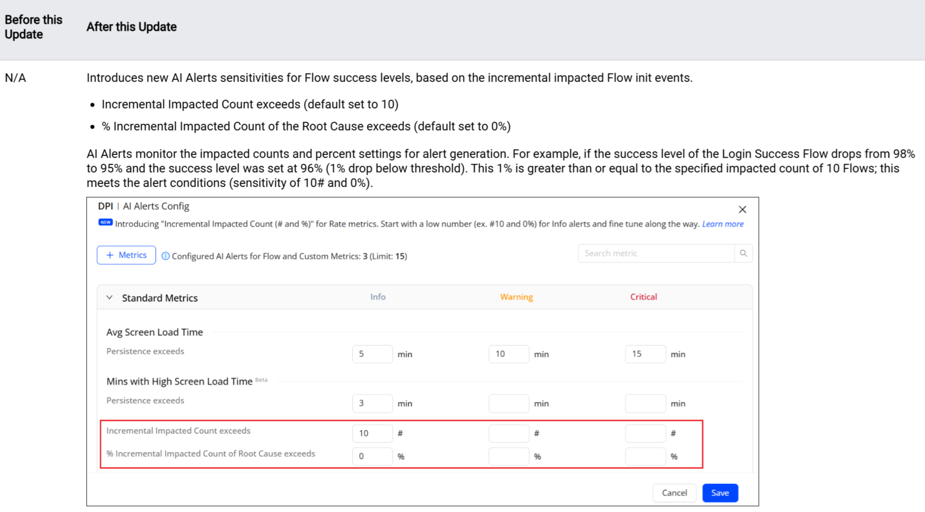 Introduces new AI Alerts sensitivities for rate-based metrics and Flow success levels, based on the incremental-impacted Flows and metric-related sessions, along with the percentage deviation above the anomaly baseline.