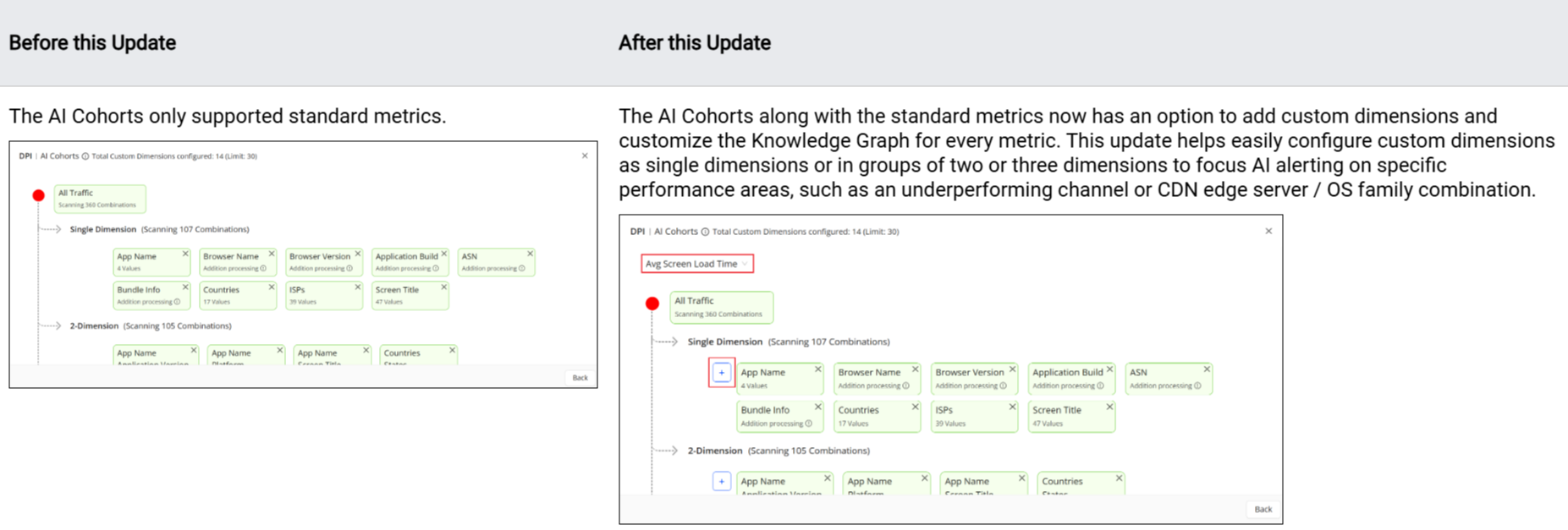 Enhances the AI Cohorts with an option to add custom dimensions and customize the Knowledge Graph for every metric. This update helps to easily configure custom dimensions as single dimensions or in groups of two or three dimensions to focus AI alerting on specific performance areas, such as an underperforming channel or CDN edge server / OS family combination.