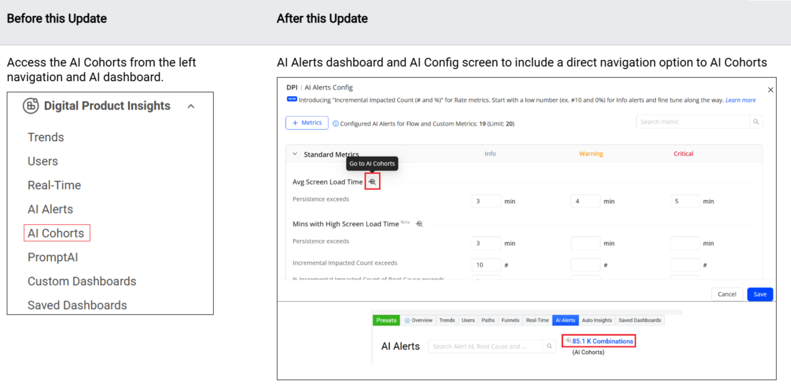 AI Cohorts in the left menu is now removed. Use the option to navigate to AI Cohorts from the AI Alerts dashboard or AI Config page.