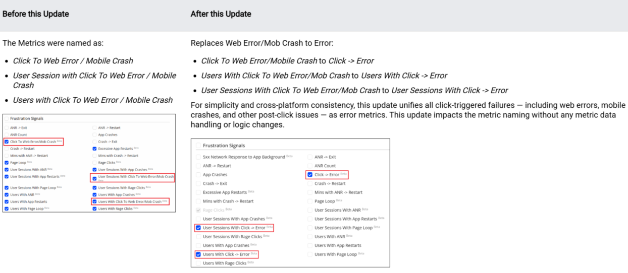 For simplicity and cross-platform consistency, this update unifies all click-triggered failures — including web errors, mobile crashes, and other post-click issues — as error metrics. This update impacts the metric naming without any metric data handling or logic changes.