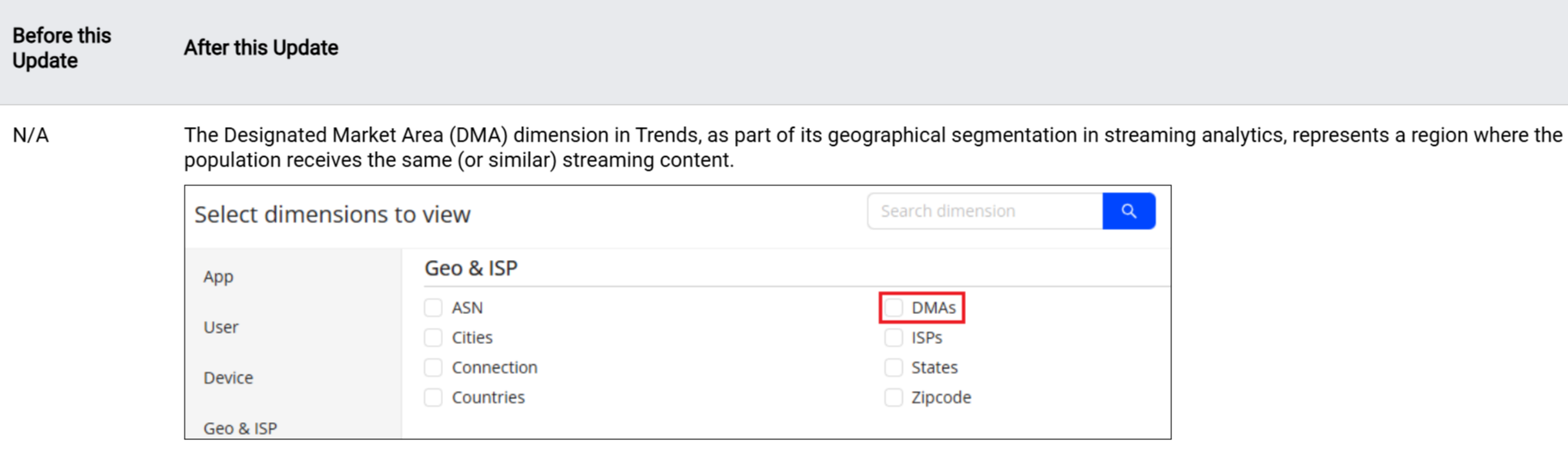 Adds the Designated Market Area (DMA) dimension in Trends as part of its geographical segmentation in streaming analytics. A DMA represents a regional area in which the population receives the same (or similar) streaming content.