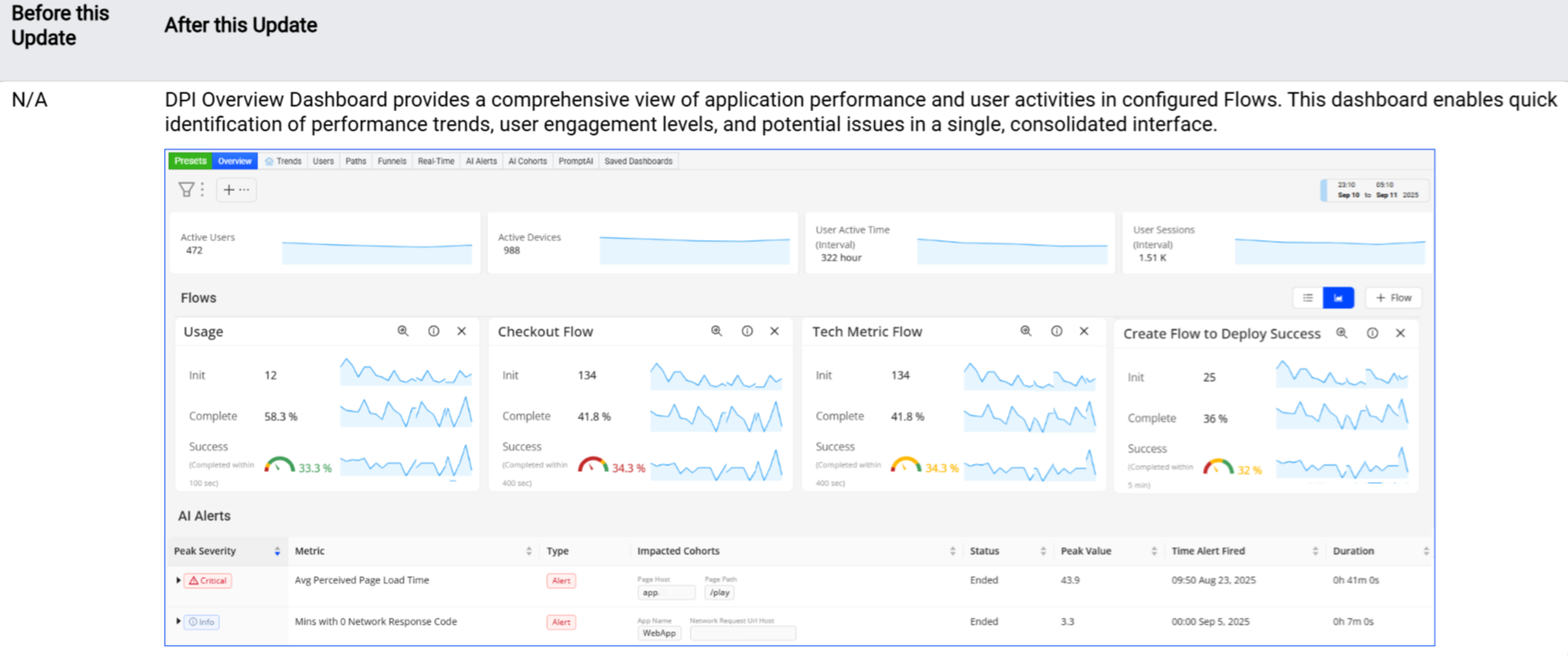 Introduces the DPI Overview Dashboard with a comprehensive view of application performance and user activities in configured Flows. This dashboard enables quick identification of performance trends, user engagement levels, and potential issues in a single, consolidated interface.