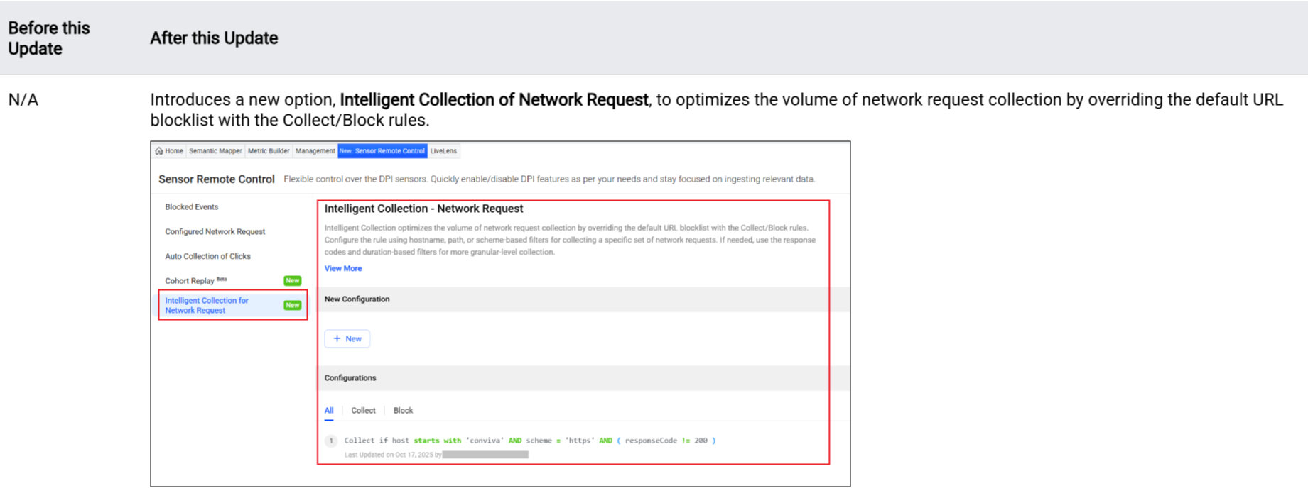Introduces a new option, Intelligent Collection of Network Request, to optimize the volume of network request collection by overriding the default URL blocklist with the Collect/Block rules.