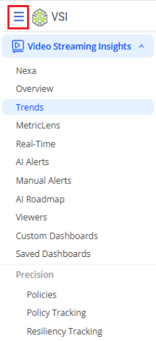 The navigation hamburger menu enables quick selection of the main VSI features, saved dashboards, and other Conviva applications to which you have access.