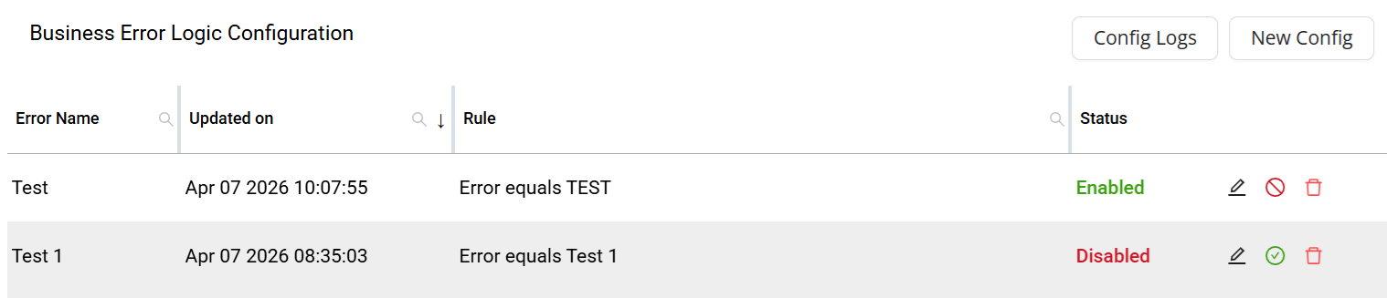 Note: Newly created Business Error Configuration rules are enabled by default.