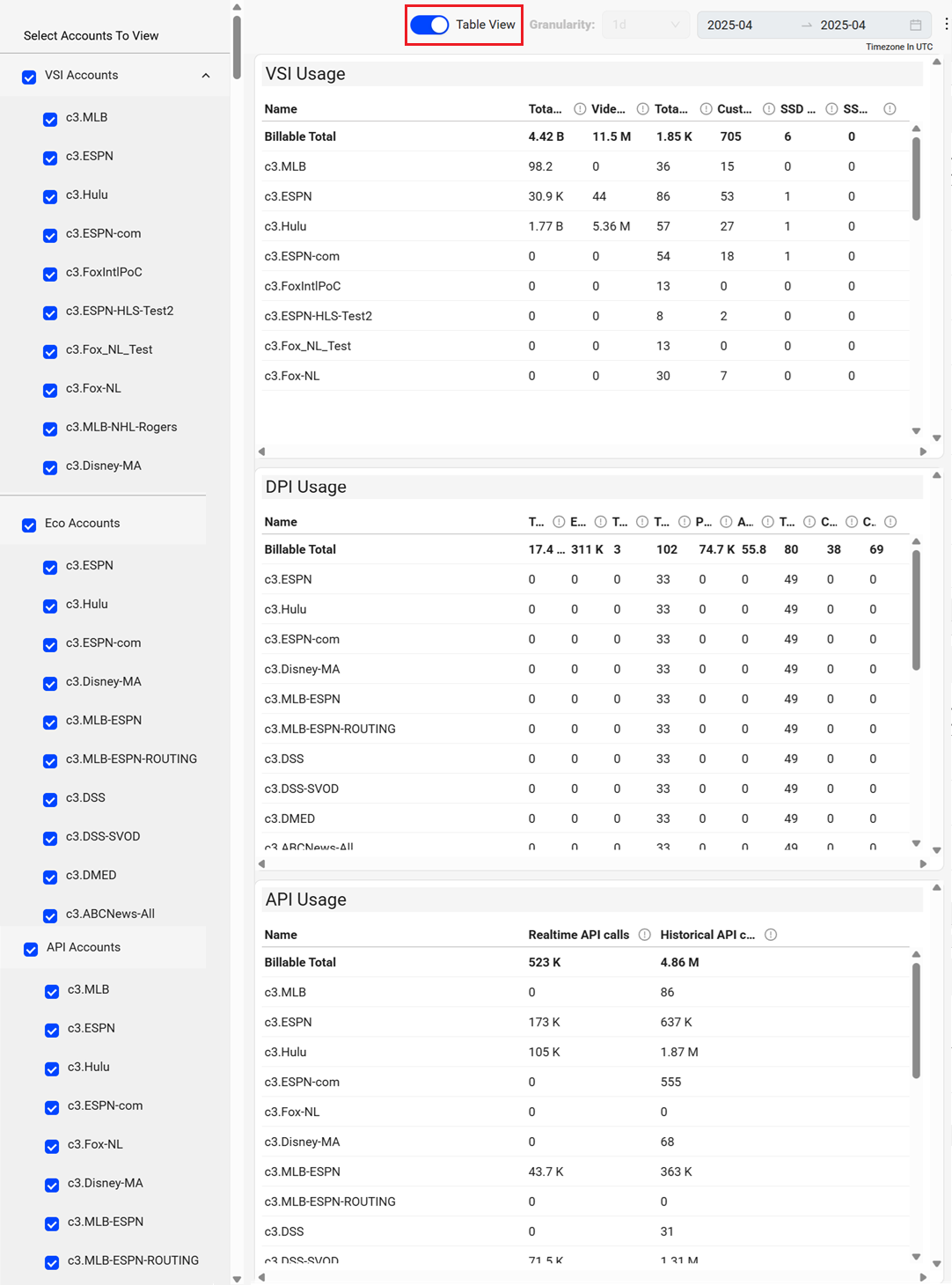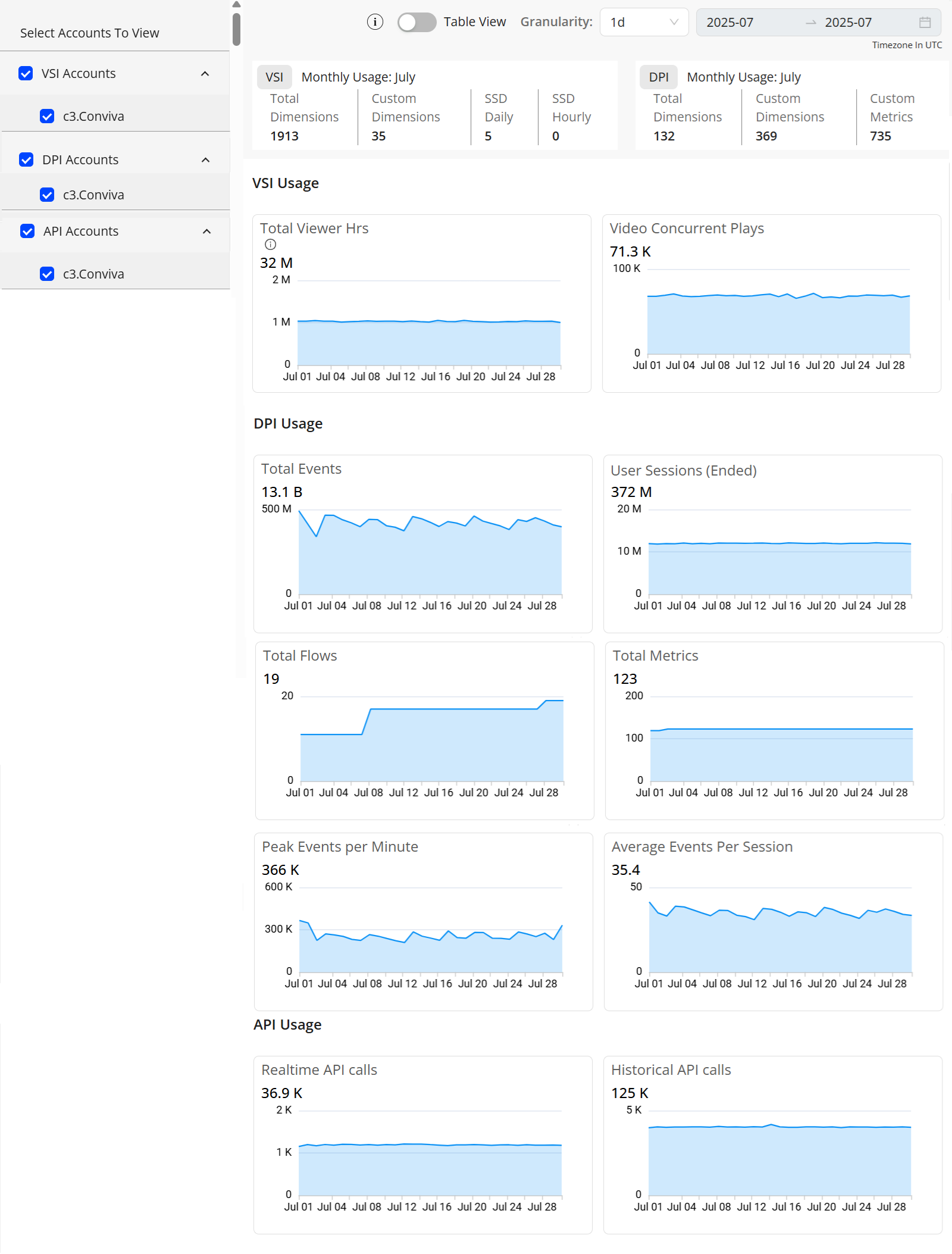 The Usage dashboard provides an interface for monitoring the monthly usage summary of key VSI and DPI metrics, along with a detailed view of the data points for each interval within the selected time range for the specified accounts related to Conviva account billing.