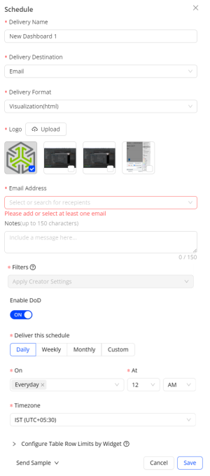 Select one of the options from the "Send Sample" drop-down list to receive a sample delivery of the custom dashboard for validation.