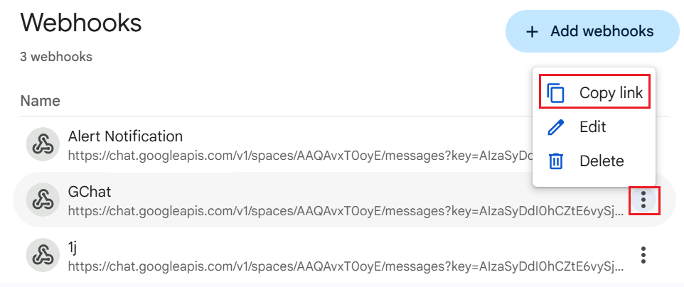 Copy the Webhook URL generated by Google Chat.