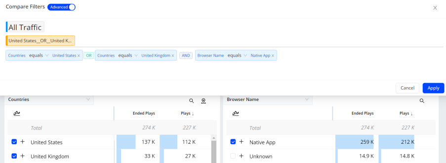 To create a filter for a known combination of dimension values (building the filter options in the panel before applying settings), click the + symbol next to the dimension values to add the values to the combinatorial filter box. Clicking the + symbol next to additional dimension values creates complex filters based on logic OR and AND filter rules.