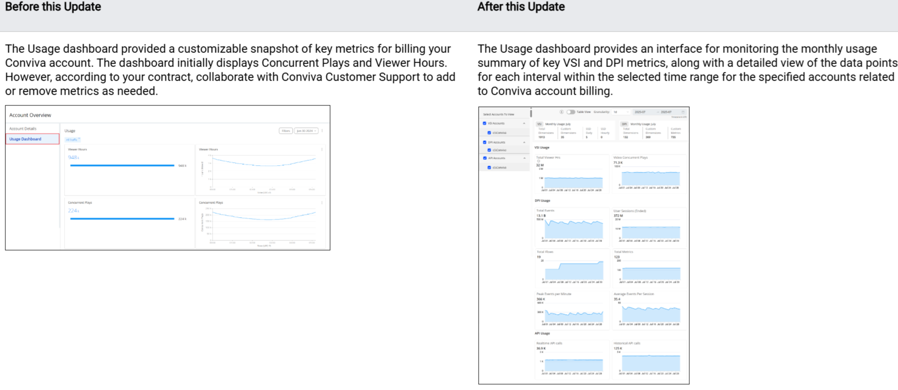 The Usage Dashboard provides a centralized view of VSI and DPI consumption across all Conviva billing accounts. This dashboard enables teams to track usage at both a monthly and interval-level granularity, ensuring greater transparency and control over resource utilization.
