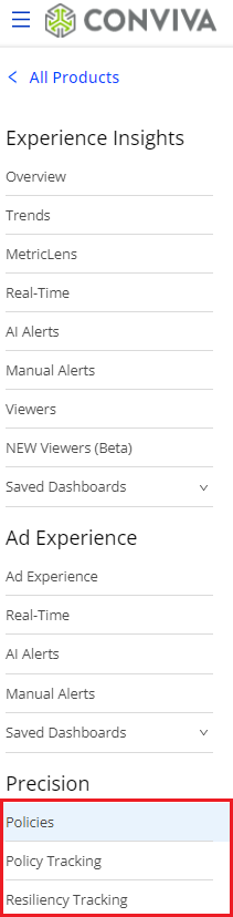 Precision runs as a Conviva Pulse application. To get started with Precision, request permission from your administrator who will contact Conviva Support (support@conviva.com) to have your account enabled. Once your account is enabled, access Precision from the Conviva Pulse application selector in the left navigation panel.