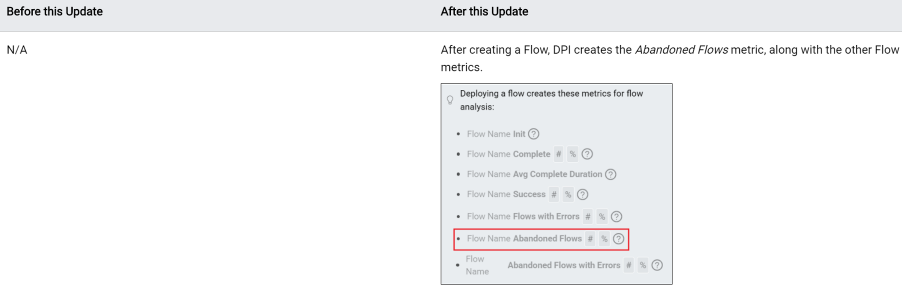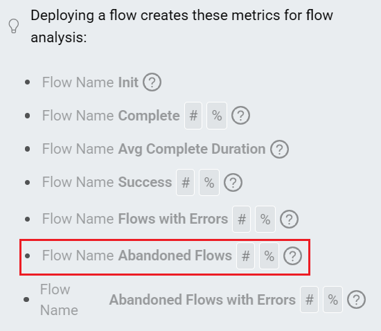 Adds the Abandoned Flows metric to measure the number of Flow attempts that did not complete successfully within the user-defined Flow Duration Limit, maximum 1 hour.