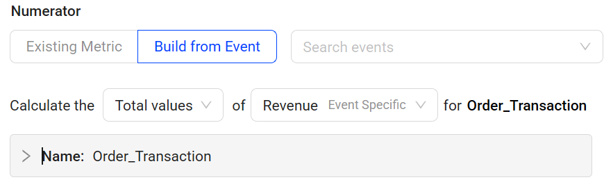 Adds a new Ratio metric type in the Individual Metric Builder to build metrics that display the relationships or proportions using mapped event values and OOB/custom aggregation metric values, such as average order value and average session starts to checkout complete. The Ratio metric type provides an additional level of analysis in Trends, such as analyzing the rate of how many orders were made relative to how many page visits occurred. Ratio numerator and denominator values support event counts, average values, and total values from mapped events.